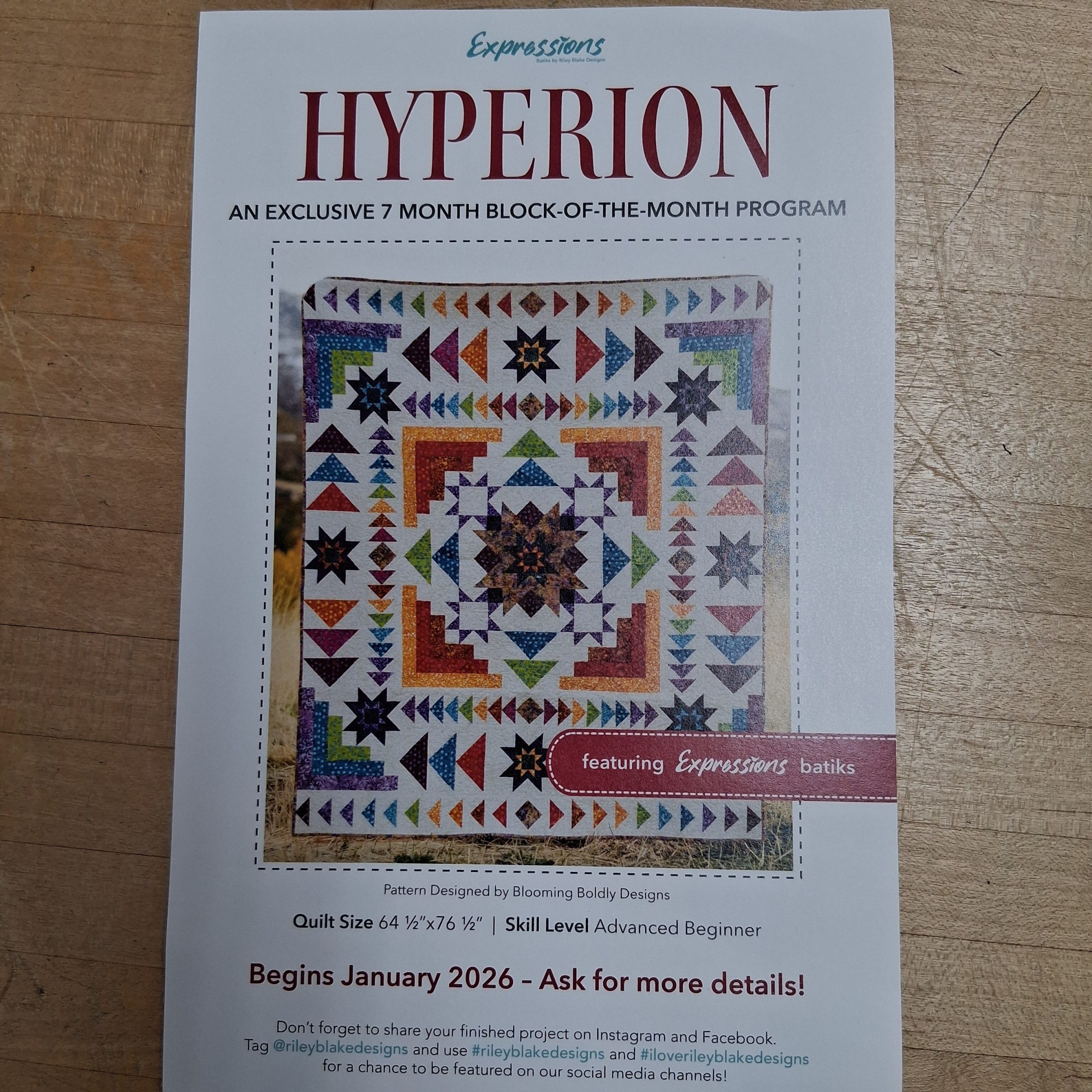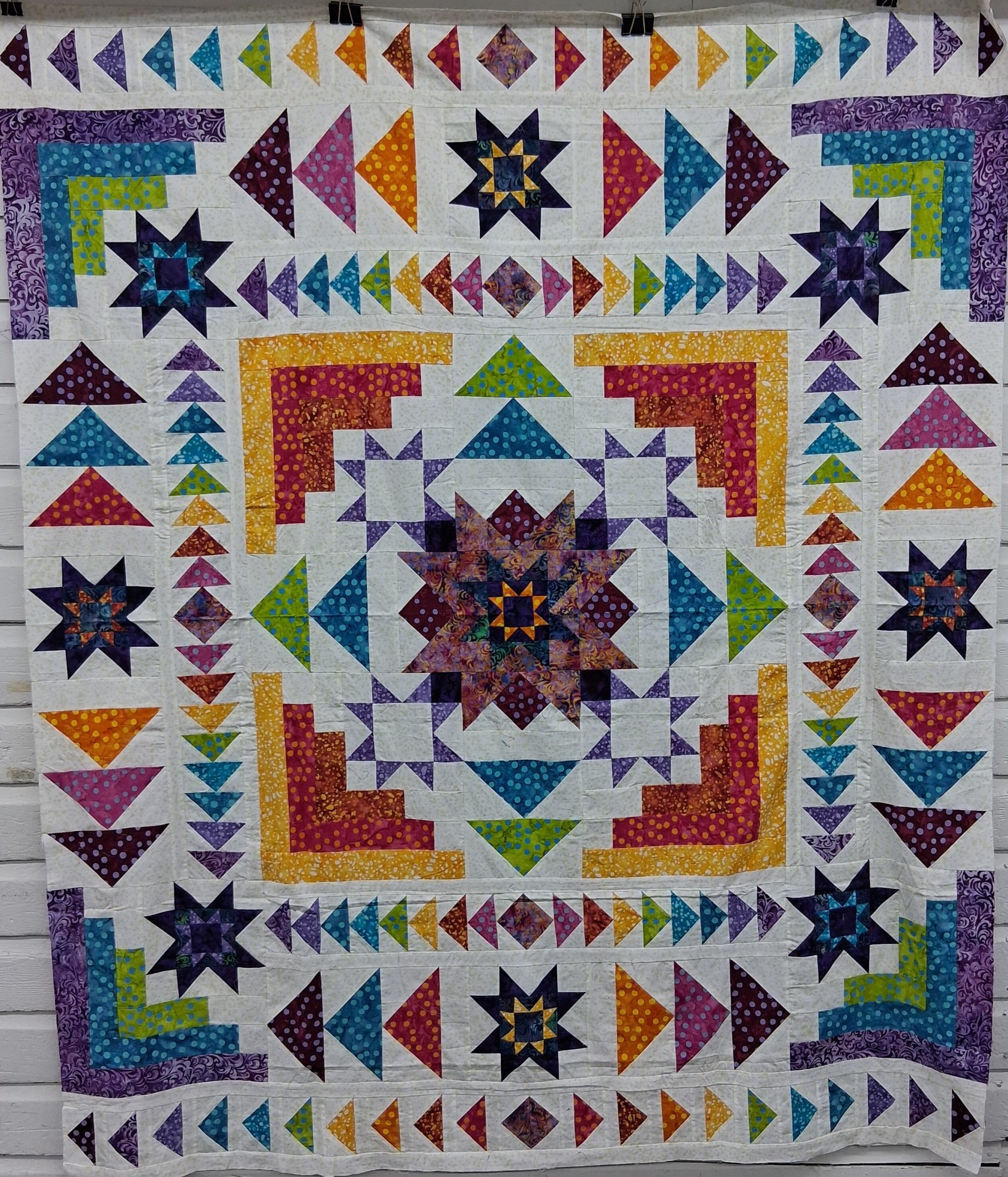 This is a 7 month block of the Month through Riley Blake Designs called Hyperion! This quilt uses their expressions Batik fabrics.